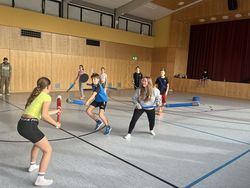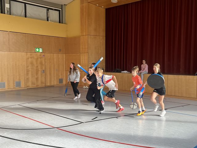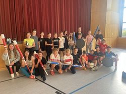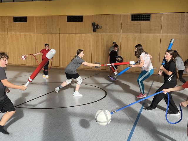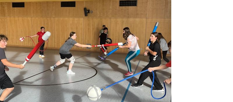 Um auch im siebten Schuljahr als perfektes Team zu starten, haben wir (LG 7/2) am 21.10.25 einen Jugger-Nachmittag in der Sporthalle eingelegt. Zwei Stunden lang hat uns Siggi Lenz die Sportart Juggern erklärt und mit uns in vier Teams ausgetestet. Trotz kleinerer Plessuren hatten wir super viel Spaß und sind nochmal mehr zusammengewachsen. Ausgepowert haben wir diesen tollen Nachmittag beendet.
